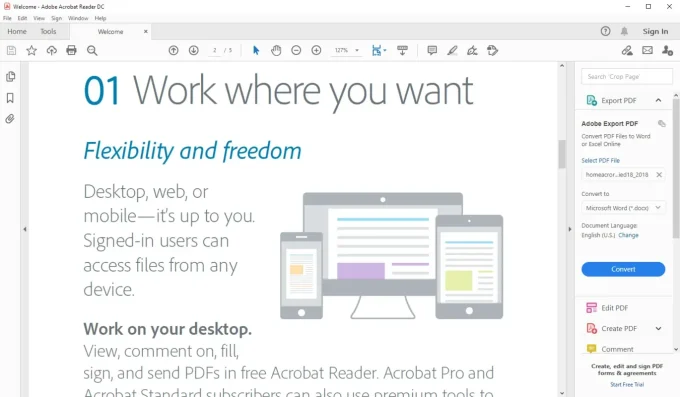 - نسخة أدوبي أكروبات ريدير دي سي هي نسخة مجانية مخصصة لملفات PDF وتوفر خدمات مثل إضافة التعليقات والتظليل وتنسيق النصوص كما تم توضيحه سابقًا، تتوفر هذه النسخة لأجهزة ويندوز وماك وليس هناك فرق في الإصدار حيث تعمل على الإصدارات الحديثة والقديمة.