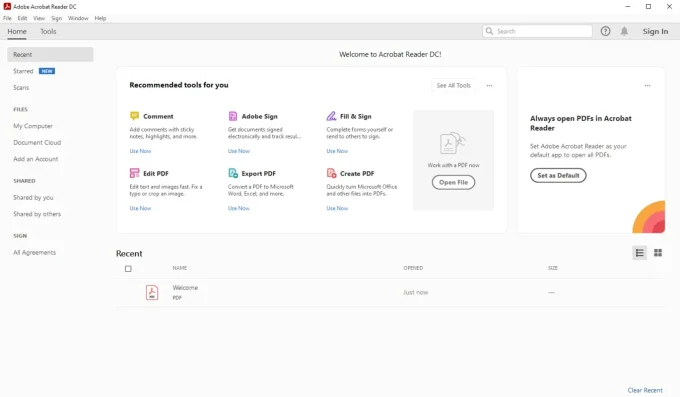 - بمجرد فتح برنامج Adobe Reader على الكمبيوتر ستظهر لك نافذة تضم جميع الملفات المتاحة على الجهاز، عليك اختيار الملف الذي تريد العمل عليه سواء كان ملفًا موجودًا بالفعل أو أن تقوم بإنشاء ملف جديد.