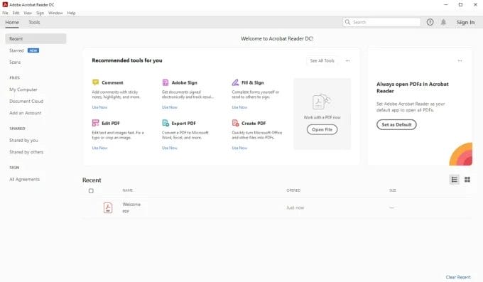- بمجرد فتح برنامج Adobe Reader على الكمبيوتر ستظهر لك نافذة تضم جميع الملفات المتاحة على الجهاز، عليك اختيار الملف الذي تريد العمل عليه سواء كان ملفًا موجودًا بالفعل أو أن تقوم بإنشاء ملف جديد.