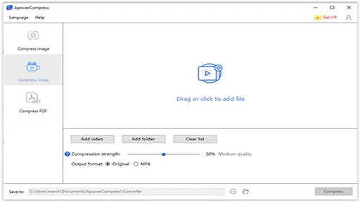 - بعد فتح برنامج ضغط الفيديوهات مع الاحتفاظ بجودتها الكمبيوتر ستظهر لك الصفحة الرئيسية أو واجهة البرنامج كما يسميها البعض، ومن خلالها يمكنك التحكم في جميع وظائف البرنامج، في أعلى الزاوية اليمنى من الصفحة ستجد زر (Get VIP)، وهذا يدل على أن البرنامج غير مفعل وأنه النسخة التجريبية، لـ تفعيل برنامج تقليل حجم الفيديو بنفس الجودة يرجى اتباع الخطوات التالية.