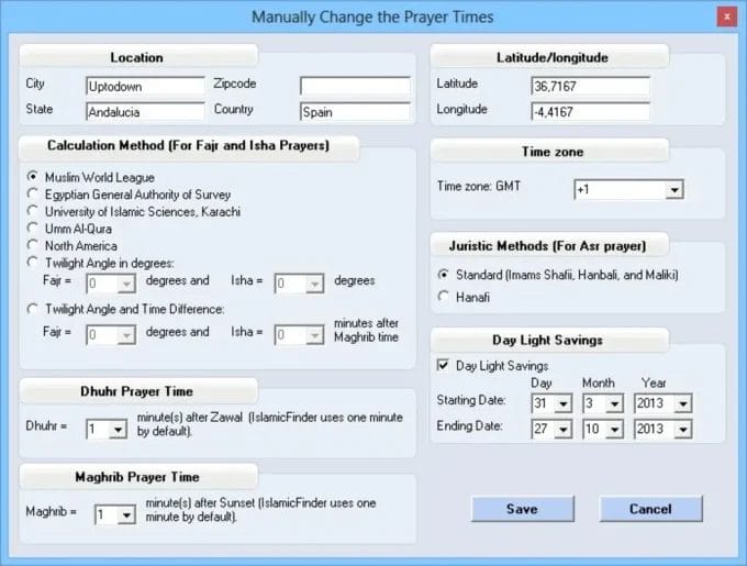 - حساب المواقيت: يمكنك اختيار طرق واوضاع مختلفة لحساب المواقيت حيث يتوفر لديك عدة خيارات يمكنك النقر على أحدها مثل الجمعية الإسلامية أو معهد الفيزياء أو الهيئة المصرية، كما يحق لك التحكم في التوقيت الصيفي والقيام بالضبط اليدوي للمواقيت وتحديدها وكل هذه الإمكانيات وأكثر يمكنك ضبطها من خلال حساب المواقيت.
