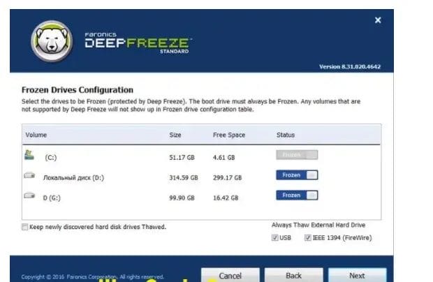 تعني مجمدة هنا أنه لن يتم الاحتفاظ بأي تغييرات على هذه الملفات بل ستختفي جميع التعديلات فور إعادة تشغيل النظام، لكن أثناء تشغيل النظام وقبل إجراء إعادة التشغيل يتم الحفظ بشكل عادي وبمجرد القيام بإعادة التشغيل سيتم فقدان كافة التعديلات التي أجريت على القرص المجمد، بغض النظر عن نوع التغييرات سواء كانت حذف أو نقل أو نسخ أو تحرير.