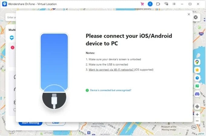 - بعد ذلك قم بتوصيل الهاتف بجهاز الكمبيوتر باستخدام الكابل، وإذا ظهرت لك أي رسالة تأكيد على شاشة الهاتف وافق عليها مباشرة ثم انتظر حتى يتم توصيل برنامج دكتور فون بهاتفك بشكل صحيح.