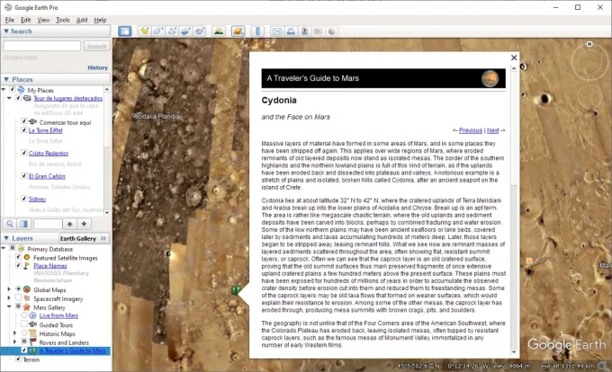 - كوكب المريخ: الكوكب الأحمر الذي يجذب اهتمام العلماء على الأرض أصبح الآن بين يديك، إذا كنت مهتمًا يمكنك استكشاف كوكب المريخ عن كثب والتعرف على تفاصيله الدقيقة من خلال صور ثلاثية الأبعاد التي ستتيح لك معرفة تضاريس الكوكب ورؤية معالم شهيرة عليه على سبيل المثال الشكل البشري الذي تم تصويره هناك، ستحصل على صور محدثة تمامًا حيث أن مصدر هذه الصور هو وكالة ناسا للفضاء التي تبث هذه الصور بشكل فوري عبر خدمة جوجل إيرث برو.