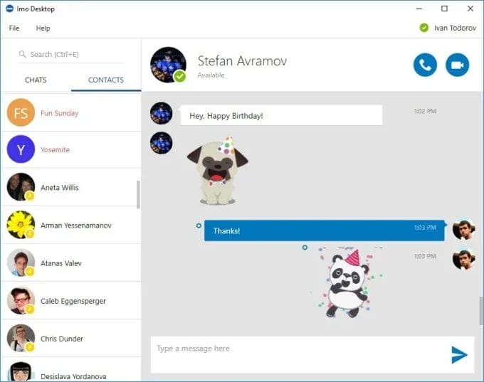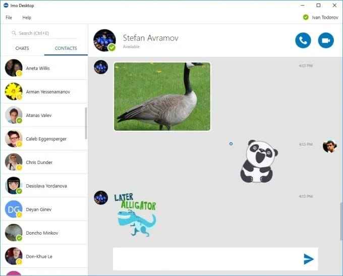 - ملصقات تعبيرية: يتيح تطبيق ايمو بلس imo for windows 10 أكثر من 100 ملصق مجان وهذه الملصقات متنوعة ومختلفة، ومن الجميل أنها تساعد في اختيار التعبير المناسب وإرساله سواء كانت تعبيرات عن الغضب أو الحزن أو الفرح أو الحماس وغيرها من الملصقات المتنوعة.