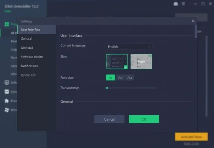 - الإعدادات المتقدمة: من خلال هذه الخيارات يمكنك التحكم في اللغة المستخدمة في تحميل برنامج ازالة البرامج المخفية من جذورها حيث يتيح لك البرنامج اختيار من مجموعة كبيرة من اللغات، بالإضافة إلى ذلك يمكنك تغيير حجم الخط والتحكم في عملية إلغاء تثبيت البرامج مما يسهل عليك إزالة أي برنامج بسرعة كما تحتوي الإعدادات على أفضل طريقة لتحديث برنامج IObit Uninstaller وتتيح لك التحكم في إزالة الملفات المتبقية تلقائياً، وكذلك حذف الملفات ونقلها إلى سلة المحذوفات بالإضافة إلى العديد من الإعدادات الأخرى.