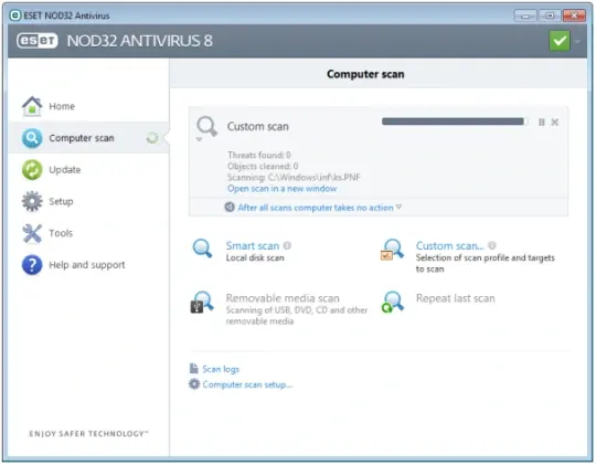 - إيقاف واستئناف الفحص في أي وقت: مع التقدم الكبير في التكنولوجيا وزيادة أحجام الذاكرة حتى 4 تيرابايت أصبح إتمام الفحص في فترة زمنية قصيرة كما كان في السابق أمرًا صعبًا جدًا، لذلك تم تزويد برنامج نود أنتي فايروس المجاني بخاصية استئناف الفحص، تسمح هذه الخاصية لبرنامج Nod32 Antivirus بتسجيل نقطة لاستعادة المكان الذي توقفت فيه عملية الفحص مما يمكن المستخدم من إيقاف الفحص الشامل أو الدقيق للنظام في أي وقت واستئنافه لاحقًا إذا استلزم الأمر وقتًا أطول.