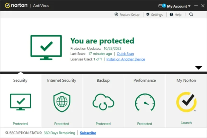 بعد ذلك تظهر الواجهة الرئيسية لبرنامج Norton Antivirus والتي تحتوي على بعض الإعدادات مثل الخصوصية وتعديل إعدادات البرنامج بالإضافة إلى ردود فعل المستخدمين وتبويب الحساب والاتصال بالدعم الفني وعنوان البريد الإلكتروني الخاص بالمستخدم كما تقدم معلومات عن الحماية واستهلاك المعالج بالإضافة إلى زر لبدء عملية فحص الجهاز وزر لتحديث قاعدة البيانات أو البرنامج كما تشمل الإعدادات الخاصة بتعديل البرنامج وإدارة التطبيق والبرنامج الخاص بالهواتف المحمولة ونسخ الاحتياط والاسترجاع، لفحص الجهاز يقوم المستخدم بالضغط على زر البدء.