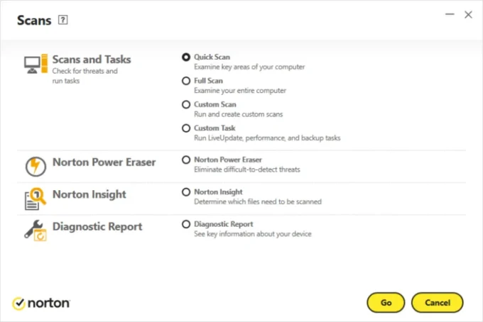 بعد ذلك يمكن اختيار الفحص السريع للجهاز أو الفحص الشامل للنظام أو الفحص المخصص الذي يتيح لك تحديد الملفات والمجلدات التي ترغب في فحصها بالإضافة إلى أدوات التصحيح وأداة فحص حائط الفيسبوك، إذا قمت بالضغط على زر إلغاء الفحص ستظهر لك نافذة لتأكيد إلغاء الفحص أو متابعة العملية، يفضل التأكد من تحديث قاعدة البيانات في برنامج نورتون من خلال الدخول إلى قسم قاعدة البيانات حيث يمكنك رؤية عدد الأيام منذ آخر تحديث قمت به، لبدء تحديث قاعدة البيانات اضغط على (بدء التحديث) وستظهر لك شريط يوضح عملية التحميل وكذلك مرحلة التحقق من قاعدة البيانات ومرحلة تحميل أحدث قاعدة بيانات متاحة في البرنامج كما يظهر أيضاً حالة عملية التحديث وزر لإلغاء عملية التحديث مما يعيد المستخدم إلى الواجهة الرئيسية للبرنامج.