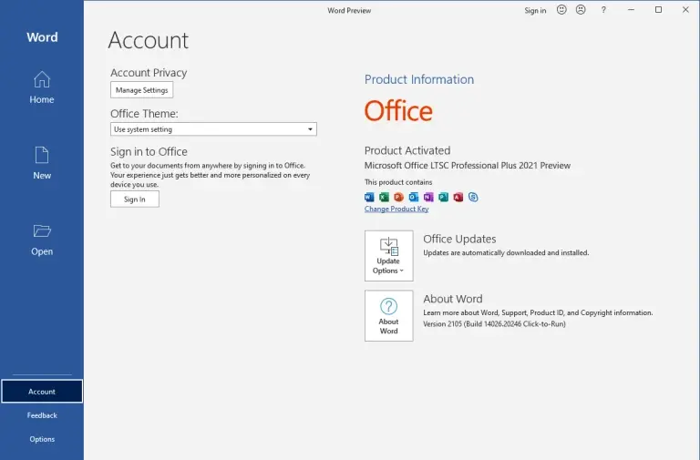 - في صفحة الحساب، ظهر بعض الخيارات مثل خيار تحديثات Office 2021 المخصص للتحديثات، كما توجد قائمة بعنوان (معلومات المنتج) تحتوي على عبارة ( منتج مفعل) وتحتها عبارة (Microsoft Office 2021 Professional Plus) مما يعني أنك تمتلك النسخة المدفوعة من برنامج Office 2021 وهي مفعلة بشكل دائم.