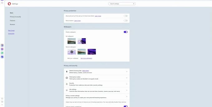 - توجد العديد من الإعدادات: تحتوي هذه النوعية من البرامج على تفاصيل كثيرة مثل خيارات التحميل والمظهر واللغة والدعم والواجهة وطريقة البحث وغيرها، لتسهيل ضبط هذه الأمور يتضمن متصفح أوبرا للكمبيوتر مجموعة كبيرة من الإعدادات المتنوعة حيث يمكنك استخدامها وفقًا لاحتياجاتك الشخصية، بمعنى آخر يمكنك تعديل الإعدادات لتناسبك بشكل أفضل.