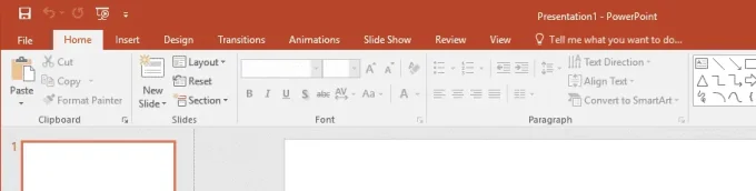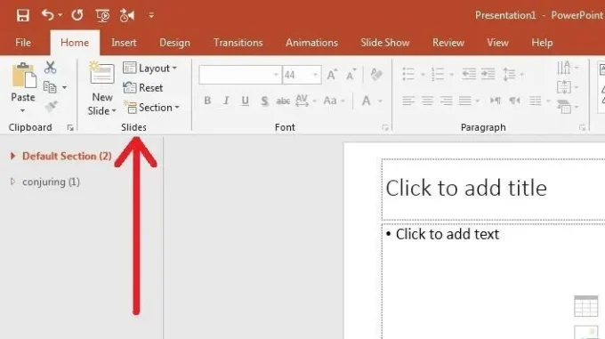 - يمكنك استخدام الأدوات المتوفرة في القسم الأول ضمن علامة التبويب لنسخ أو لصق النصوص وإضافتها إلى الشريحة كما يمكنك من نفس القسم تخطيط الصفحة أو إعادة ضبطها مرة أخرى أو إضافة شرائح جديدة.