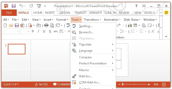 - القائمة السابقة الأخيرة تحمل عنوان (مراجعة) تحتوي هذه القائمة على مجموعة من الأدوات لمراجعة الملف والشرائح الموجودة فيه بعد الانتهاء من إعدادها، يمكنك التحكم بشكل كامل في اللغة والترجمة وإضافة تعليقات على شريحة معينة كما تتضمن هذه القائمة خاصية مميزة وهي خاصية التدفق الإملائي.