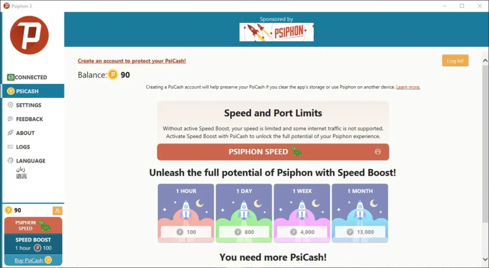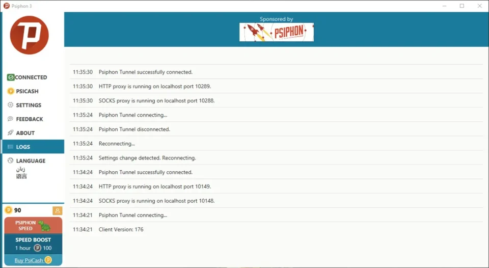 - قسم السجلات:- هو القسم النهائي في برنامج Psiphon Pro اخر اصدار وهو خاص بسجلات الاتصال والحماية حتى لا يتعرض المستخدم إلى التهديد وحماية البيانات من الإطلاع عليها.