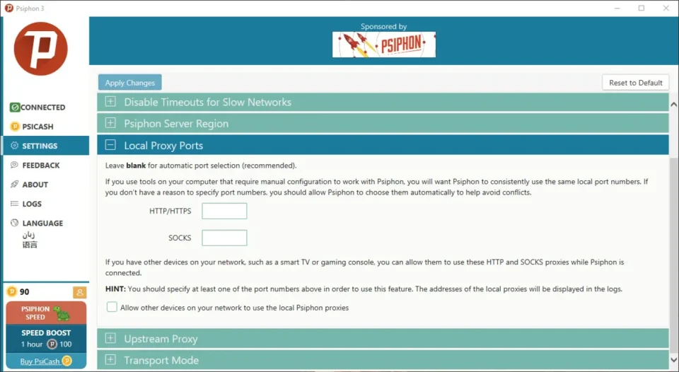 - تحديد بروتوكول vpn مناسب:- يدعم تطبيق سايفون الكثير من بروتوكولات vpn ومنها L2TP و PPTP وغيرها يستطيع المستخدم الاختيار من بينهما للبحث عن أعلى سرعة للخادم.
