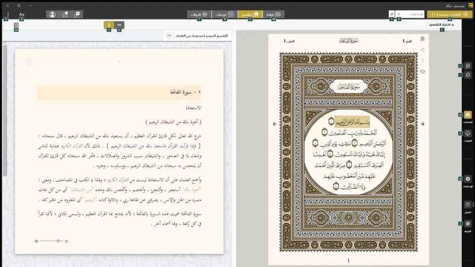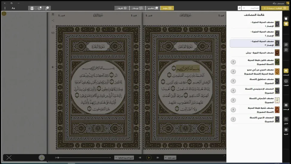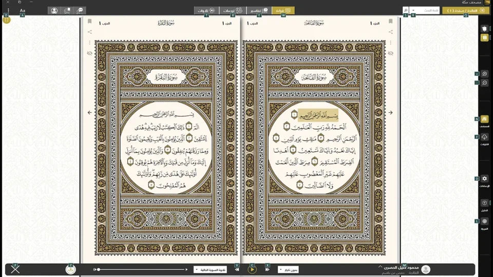بعد تنزيل القرآن الكريم للكمبيوتر النسخة المجانية وتثبيته بالطريقة سالفة الذكر، ادخل على البرنامج بالنقر على الأيقونة الخاصة به مرتين، سوف تجد في واجهة البرنامج سورة الفاتحة إلى جانب شريط إعدادات بالأعلى، والذي يشتمل على ما يي: