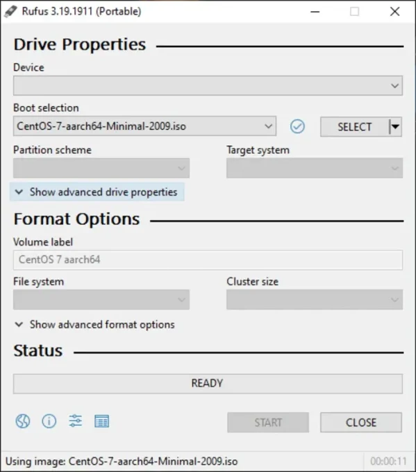 - القسم أو الجزء الأخير: تظهر واجهة برنامج Rufus الحالة العامة إما أنها جاهزة للنسخ أو ليست كذلك.