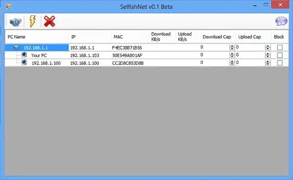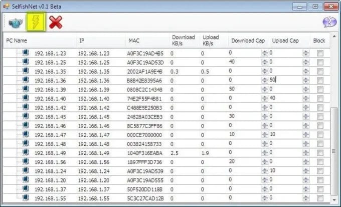 - رابعاً: لتحديد السرعات انتقل إلى خانة التحميل (Download) والرفع (Upload) للمستخدم الذي ترغب في تعديله ثم اكتب السرعة المطلوبة بوحدة الكيلو بايت، وإذا كنت تريد فصل الإنترنت عن أحد المستخدمين قم بوضع علامة (✓) في خانة الحظر (Block) أمام المستخدم المستهدف ثم اضغط على أيقونة البرق في شريط الأدوات في الأعلى لتطبيق التغييرات التي أجريتها.