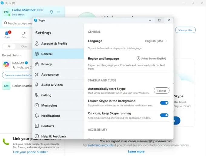 - الإعدادات العامة: تتيح لك هذه الإعدادات تحديد اللغة التي تفضل استخدامها في تطبيق Skype بالإضافة إلى إمكانية تخصيص الوضع الليلي للتطبيق مما يمكنك من التصفح والتواصل مع الأصدقاء في الظل الخافت أو أثناء الليل.