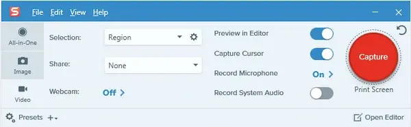 - قم بتشغيل البرنامج، بعد الانتهاء من عملية التثبيت يمكنك فتح Snagit من قائمة البداية أو من شريط المهام أو عبر مشغل جهازك، ستظهر لك واجهة التطبيق التي تمكنك من اختيار وضع وأماكن الالتقاط بالإضافة إلى خيارات الالتقاط المختلفة كما يمكنك أيضًا الوصول إلى محرر Snagit الذي يتيح لك تعديل اللقطات وإضافة التعليقات عليها ومشاركتها.