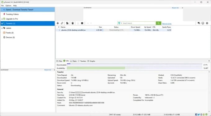 بالإضافة إلى عدد الموزعين للملف وبعض المعلومات الأخرى التي تظهر عند الضغط عليها في النافذة الثانية حيث يمكنك رؤية ما تقوم بتحميله وسرعة التنزيل بالإضافة إلى مجموعة من المعلومات التفصيلية حول الملف، وفي الأسفل توجد نافذة أخرى تعرض بعض خصائص الملف والموزعين مع قياس السرعة ومعلومات أخرى قد تفيدك أثناء تحميل أي ملف تورنت من الإنترنت على جهازك.