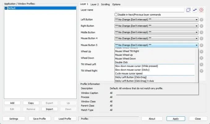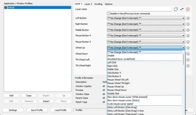 - تخصيص عجلة التمرير: بعد تثبيت البرنامج ستتمكن من إضافة العديد من الوظائف لعجلة التمرير في الماوس الخاص بك. يمكنك تخصيص هذه العجلة للتحكم في مستوى الصوت أو تقليل الإضاءة أو أي شيء آخر يتطلب تعديلاً لمستوى الارتفاع والانخفاض. تشمل هذه الميزة البرامج والألعاب بالإضافة إلى الخدمات الأساسية للجهاز أيضاً.